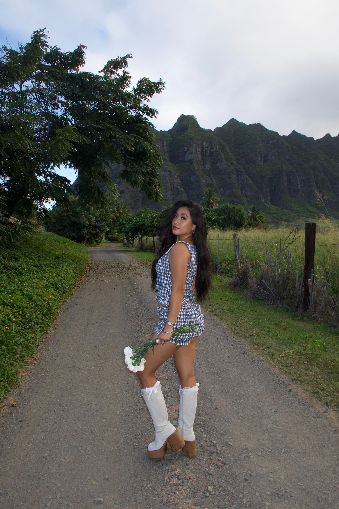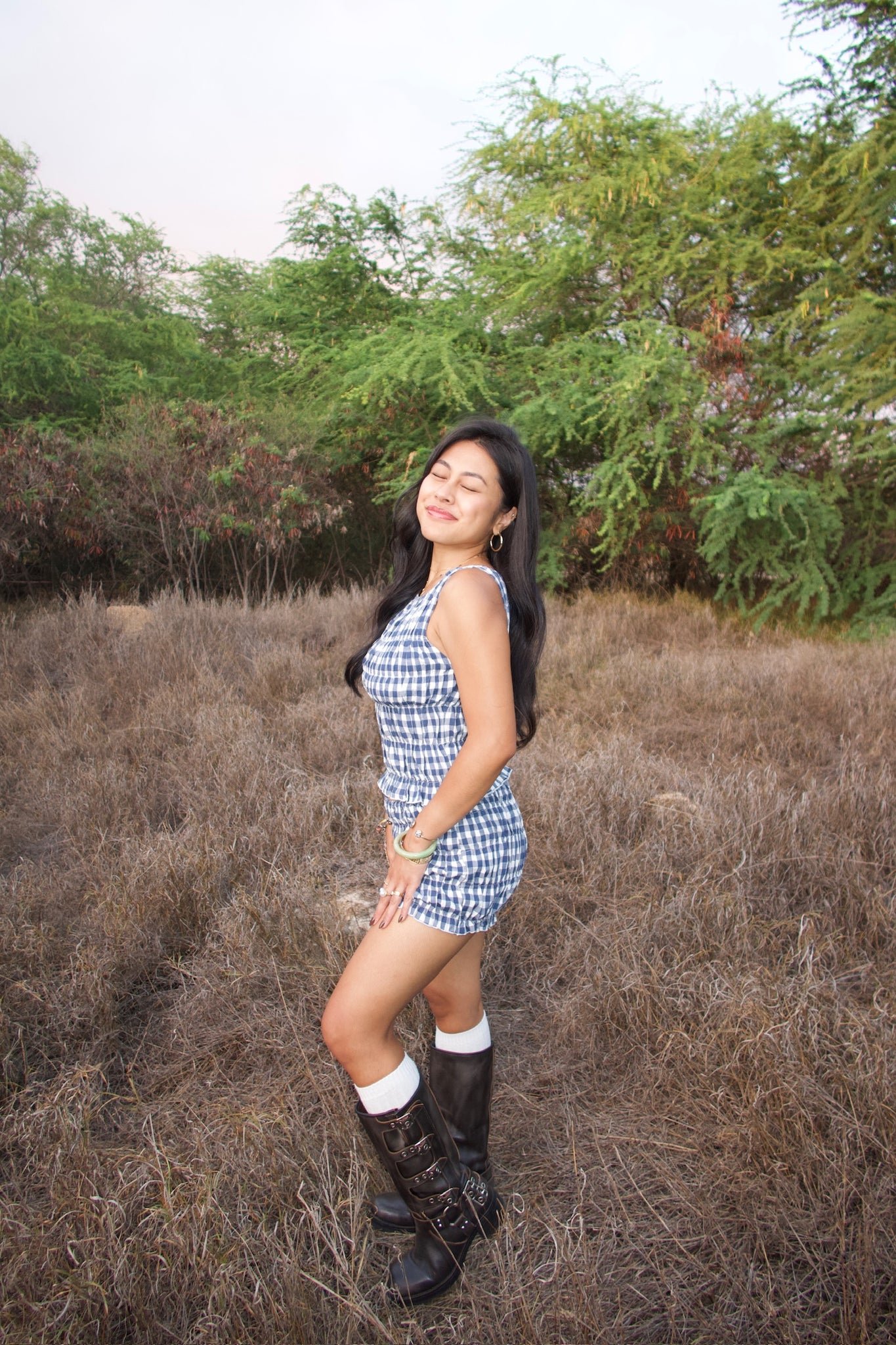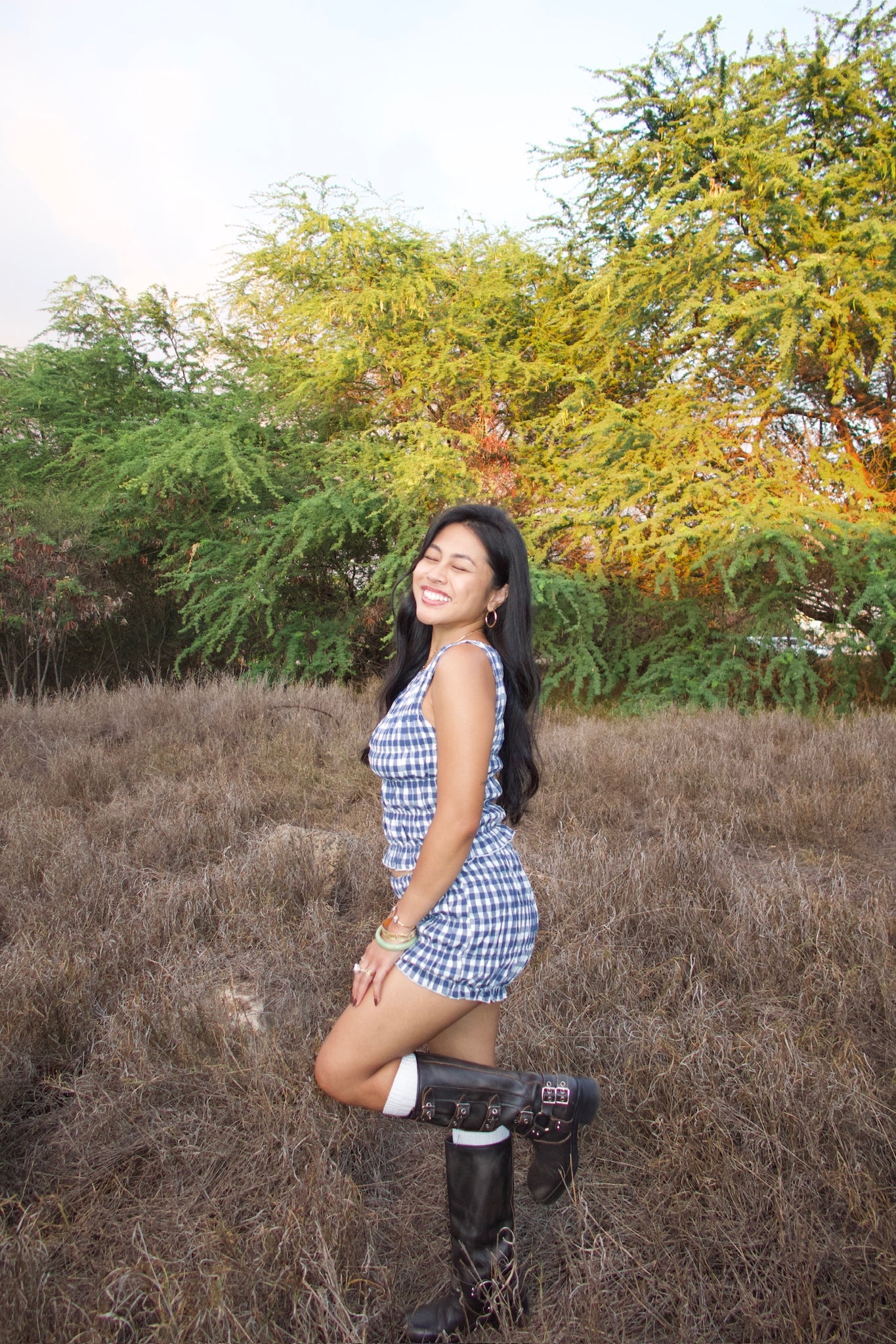Elastic smocked gingham print tank top. Elastic boat neck neckline. Unlined