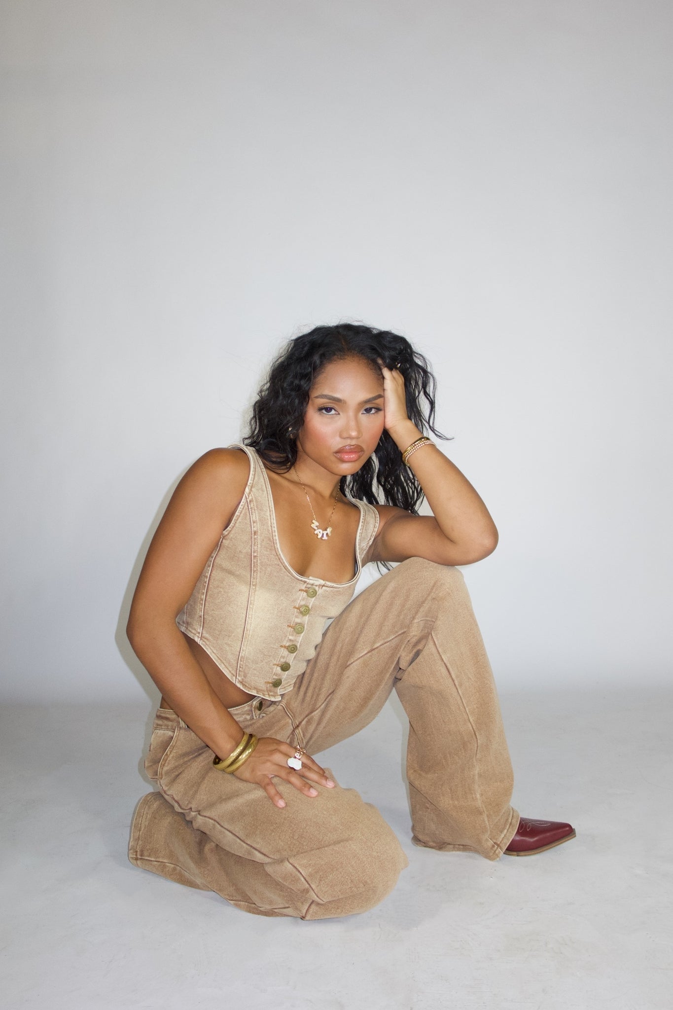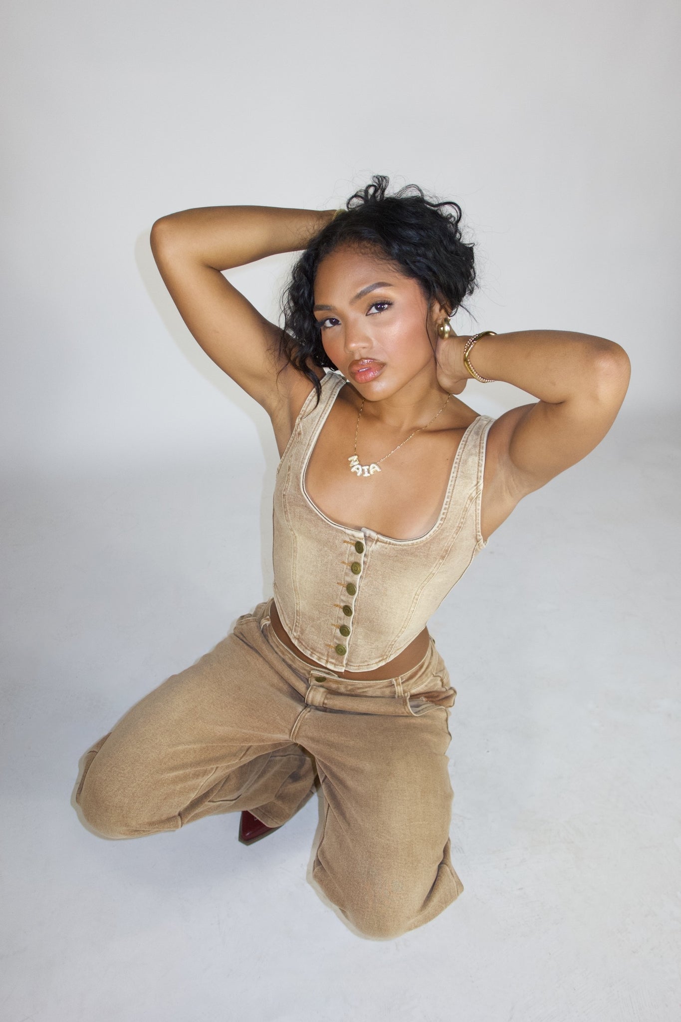 Top: Denim corset. Low scoop neckline. Front button closures. Slight stretch. Fully lined.