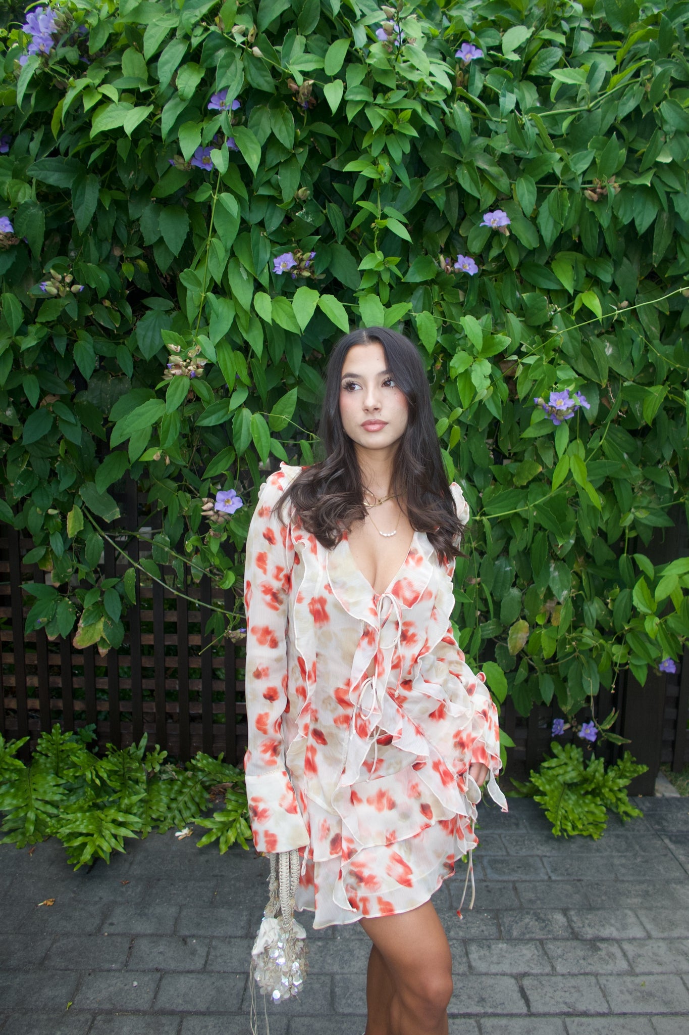Floral ruffle tiered skort. Asymmetric hem. Inner shorts lining. Side zipper closure. Side adjustable ties. Fully lined