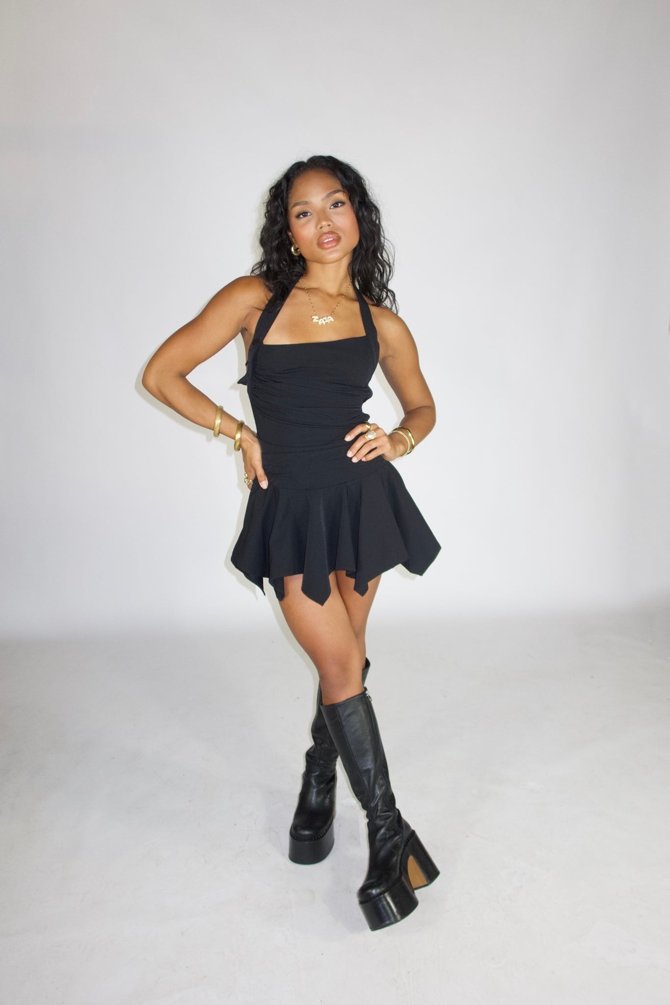 Asymmetric woven dress. Asymmetric halter neckline & adjustable strap. Adjustable lace up back. Side zipper closure. Asymmetric hem. Unlined.