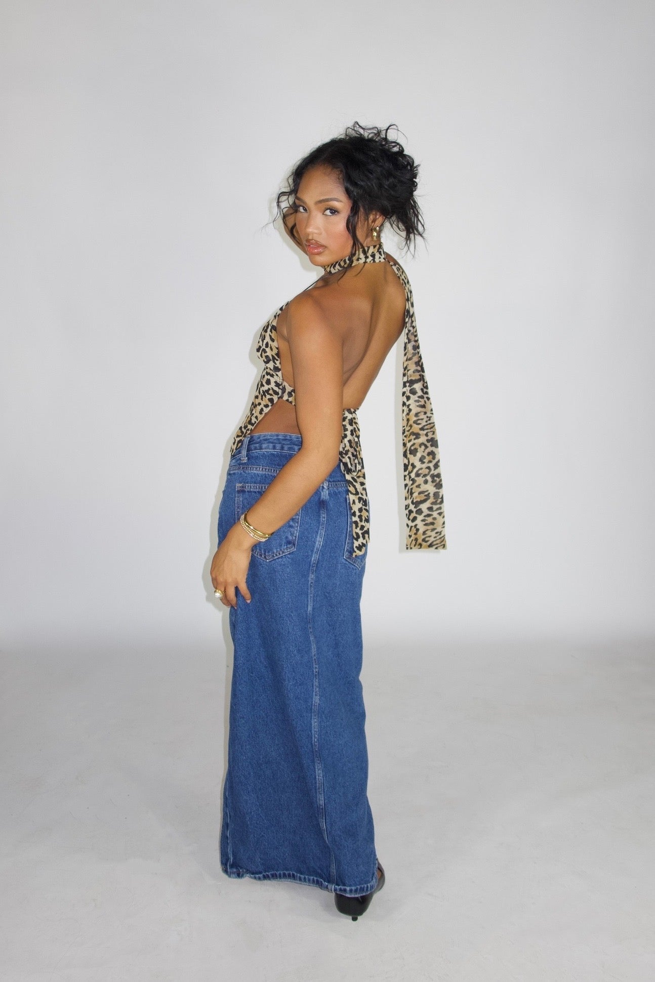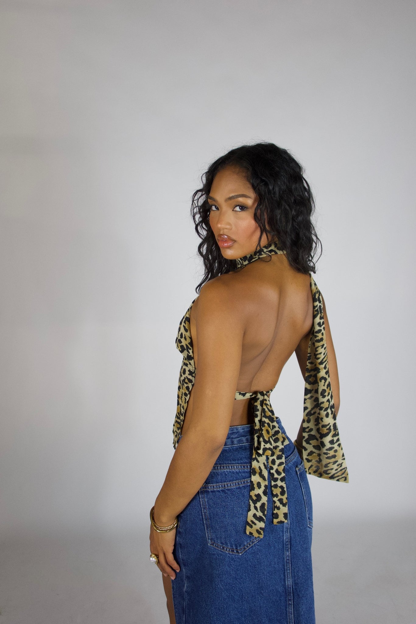 Cheetah woven haler top. Open back & adjustable back ties. Partially lined. Matching scarf